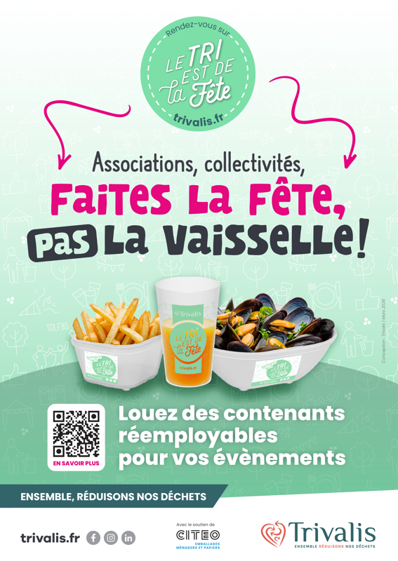 Dans le cadre de ses actions en faveur de la réduction des déchets, Trivalis propose depuis plusieurs années un dispositif global d’accompagnement destiné aux organisateurs d’événements (associations et collectivités) : « Le Tri est de la Fête ».